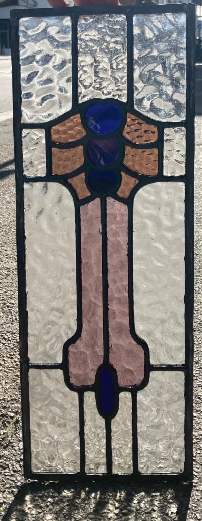 Original restored leadlight in turquoise, brown and pink with textured clear glass, 545mm H x 200mm W (LL206)