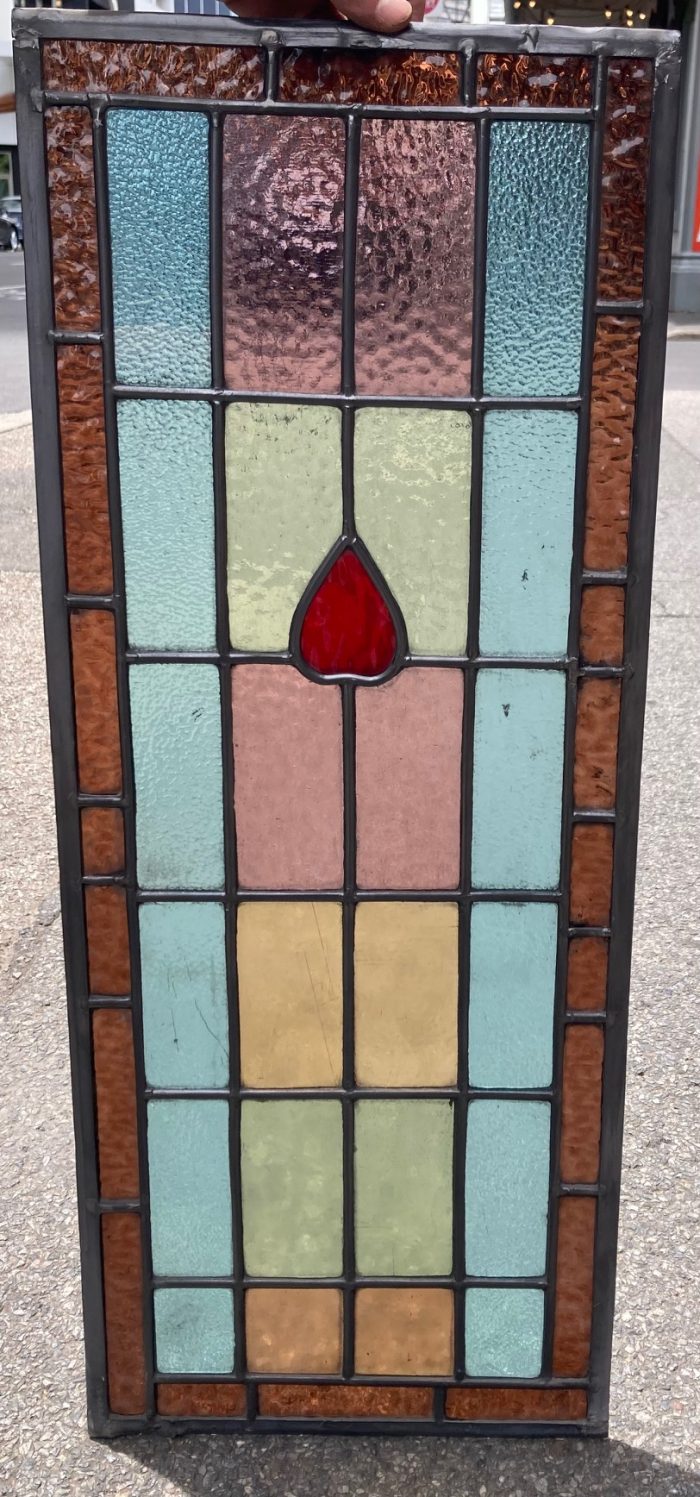 Restored multicoloured leadlight panel, blue, green, pink, yellow, brown and red 760mm H x 305mm W (LL207FOZI) $345