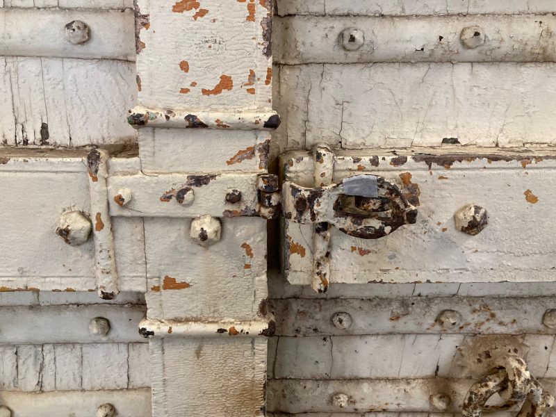 Detail of Solid antique Persian entrance door pair, heavy carved timber frame with metal studs, 2500mm high x 1460mm wide (D30) $1800