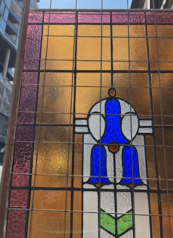 Detail of large proportion original restored leadlight panel, amber, burgundy, blue and green colourways, 1730mm H x 665mm W (LL215) $945