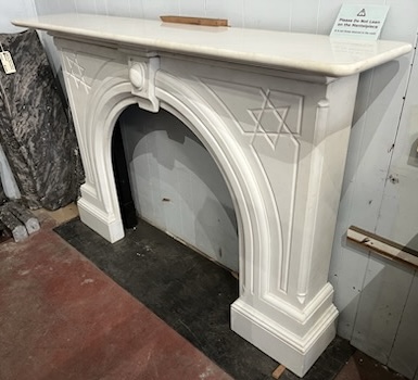 Statuary white Victorian marble mantelpiece, large proportions, ex Melbourne mansion, top shelf 1810 W x 360 D, height 1240mm, outer leg 1675 W, opening 950mm H x 940mm H, 930mm to key stone (M174) $8800