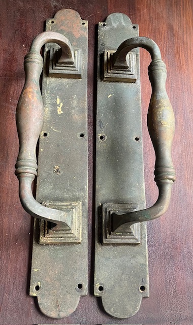 Magnificent solid brass original French door handles, leave rustic or could be polished, 45cm H x 9cm projection, (H674A) $330 pair
