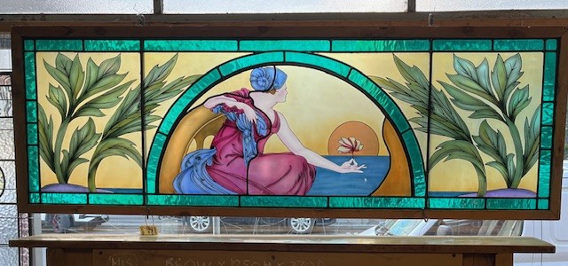 Indoor photo of exquisitely handpainted feature leadlight window panel. ‘The Rising Sun’ painted by Fozi Badaoui. Elegant woman in pink and blue at the sea holding a flower framed by the rising sun. Emerald green borders with green foliage and a yellow sky background. Dimensions of glass 1730 x 535mm (frame for display and transport only) (LL248) $3500(LL248) $3500