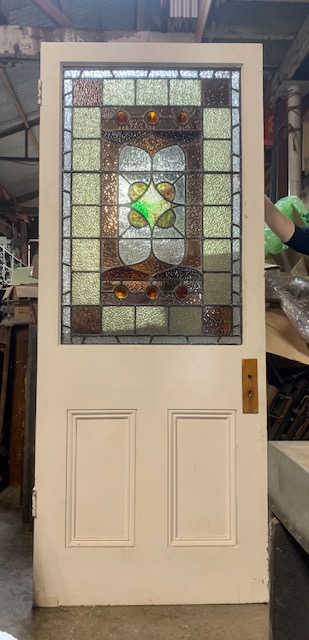 SOLD Victorian internal door with large ornate leadlight panel. Glass in browns, greens and yellows, cut glass rondells. 1990 x 810 x 35mm, $845
