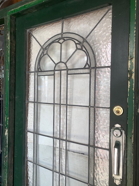 Detail of door in impressive original 1930s door frame with Art Deco clear and textured bevel glass. Arch top and sidelights. Great condition. W1825 x H 2580mm, $3200