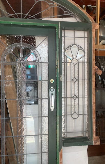 Detail of door in impressive original 1930s door frame with Art Deco clear and textured bevel glass. Arch top and sidelights. Great condition. W1825 x H 2580mm, $3200