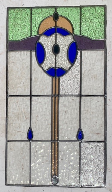 Original fully restored Art Deco leadlight panel, blue, purple, yellow and green on clear background, 450mm x 820mm (LL60) $385