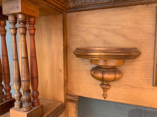 SOLD Yet more detail of original ornate timber mantel with spindle pillars, some scuffing on mirror, top shelf 1600 W x 300 D, height 1300, opening 915 x 915 (M72) $645