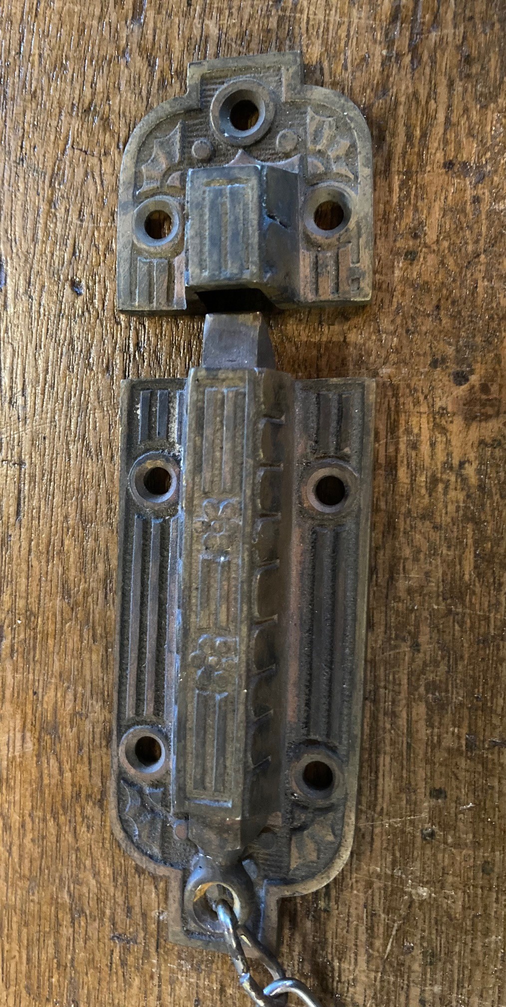Detail of chain pull latch, original ornate design, most likely from a hopper window, latch 15cm long (H44) $35