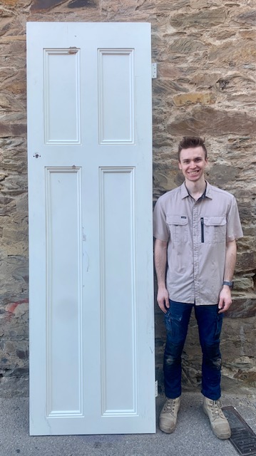 This is a timber door suitable for giraffes! Solid timber 4 panel door, 2700 H x 820 W x 40 D (our door model Luke is 6 foot 3 inches for comparison purposes) (D182) $250