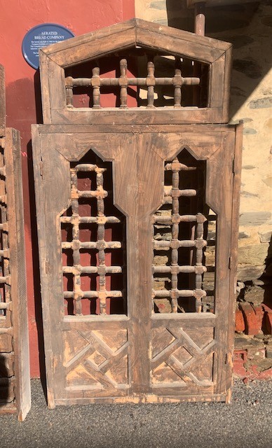 Beautiful old ornate middle eastern double window with solid carved wooden screen, and peaked gable, 1025mm wide x 1965mm high x 123mm deep (D59) $1200