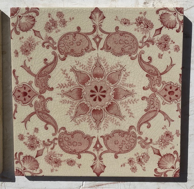 SOLD Detail of Sherwin and Cotton, England. c1895 Detailed classical print tiles, burgundy print on cream ceramic base. 151x 151 x 10mm. Pair of tiles $90 (SET465)