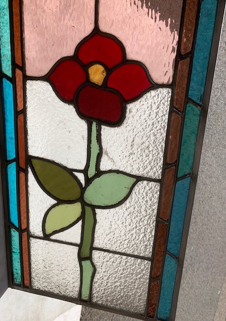 SOLD Detail of top panel pair #2 of four leadlight panels in strong blue, red and green colourways, each panel is 867mm high x 327mm wide, panel pair #1 has black detail on leaves, panel pair #2 has no detail on leaves, (LL30)