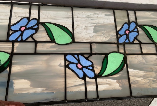Leadlight with delicate blue flowers with green leaves on milky white background, light shining through, 930mm x 355mm (LL29)