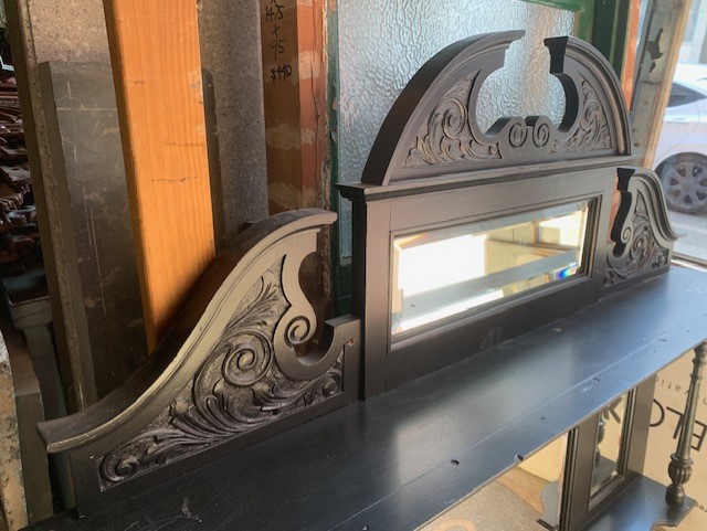 SOLD Detail of original Victorian overmantel mirror, bevelled edge mirrors, detailed turnings and carving, painted black, 1370mm wide x 1300mm high x 225mm deep (M48) $300