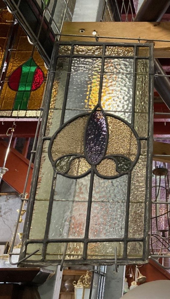Art Nouveau original leadlight panels in purple and gold, each panel is 500mm high x 235mm wide. $145 each