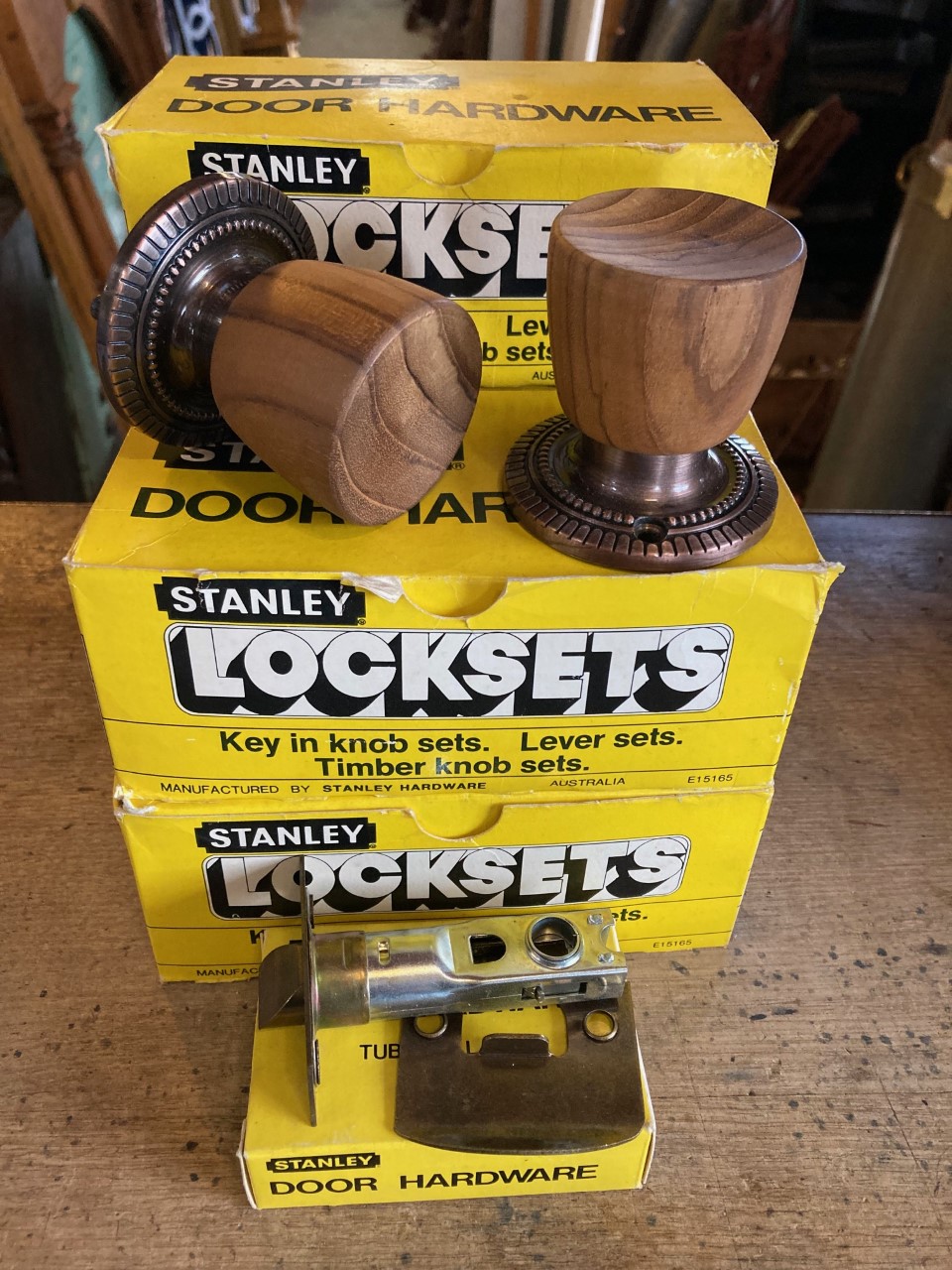 SOLD1960s unused Stanley wooden door knob sets, four complete sets @ $65 per set available and two sets of handles only available @ $25 per set