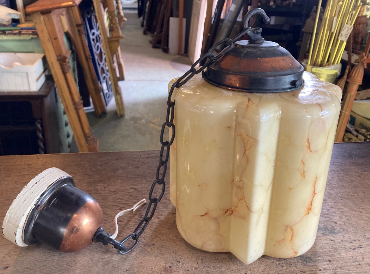 Original marbled yellow Art Deco glass pendant light with Florentine bronze chain and fittings. Shade 180mm high x 200mm wide with 470mm drop $265