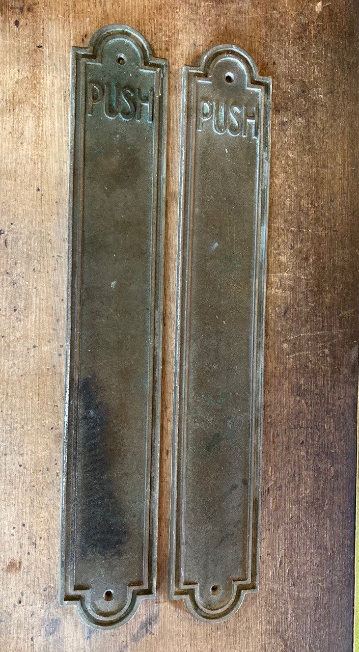 SOLD please see website for more options Published 10 December 2022 at 705 × 1280 in SOLD please see website for more options SOLD Large pair of bronze door push plates, 505mm long x 82mm wide $165 the pair Large pair of bronze door push plates, 505mm long x 82mm wide $165 the pair
