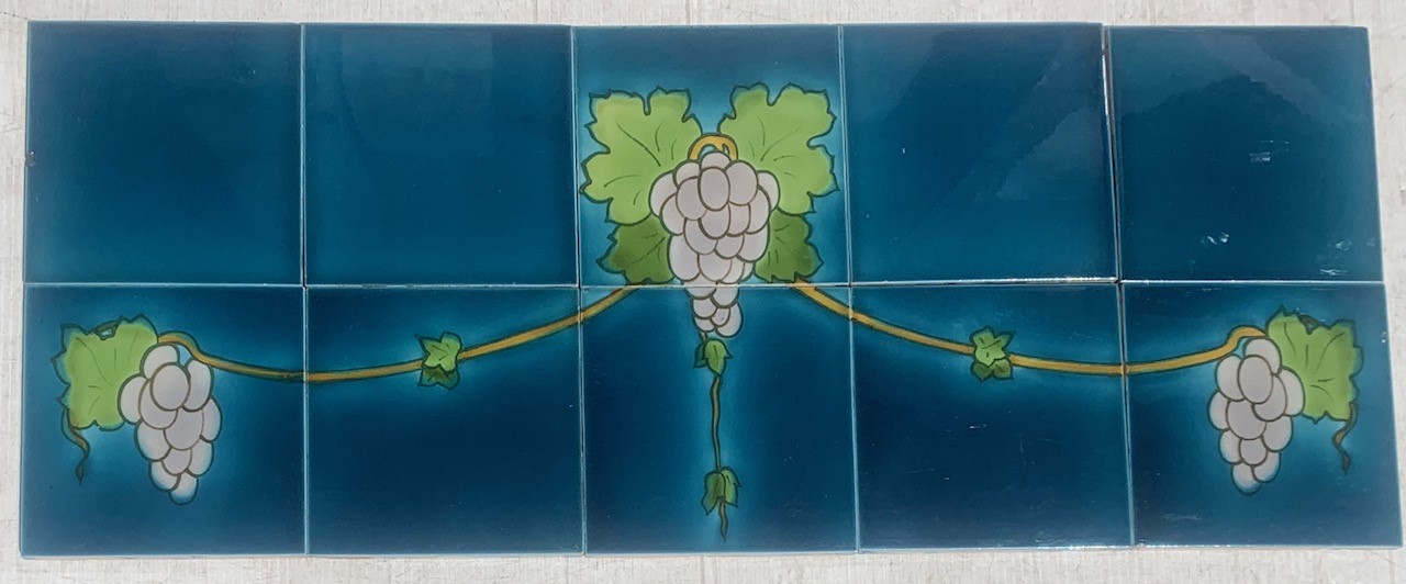SOLD Rare JH Barratt and Co. England. decorative tile panel produced between 1910 and 1926. hand slip-trailed outline. soft lavender grapes with leaves and vine on mid to deep blue background. Suit wall feature / washstand. Length 769 x height 307 x tile thickness 10mm. (SET488) $540