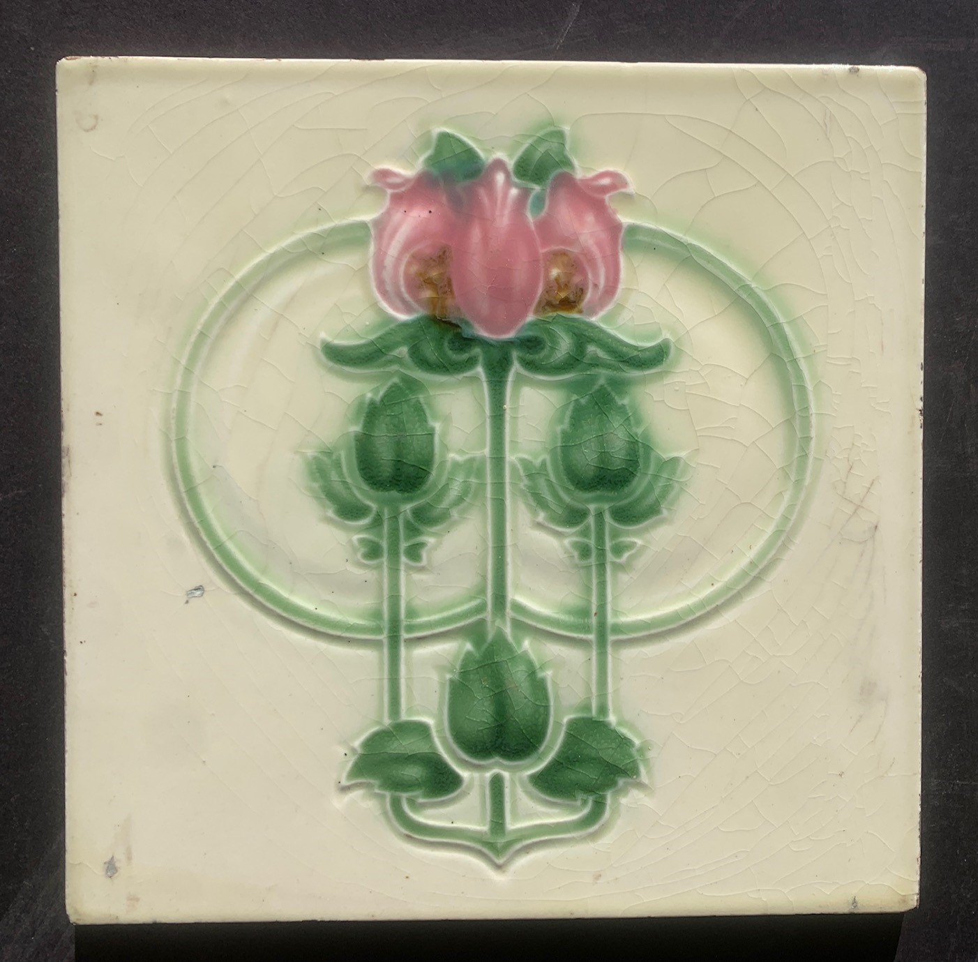 SOLD detail of T and R Boote, England c 1900. moulded Art Nouveau feature tiles with pink flower and mid green foliage on cream background, some chips, 153 x 153 x 9mm, (SET492) $50 pair