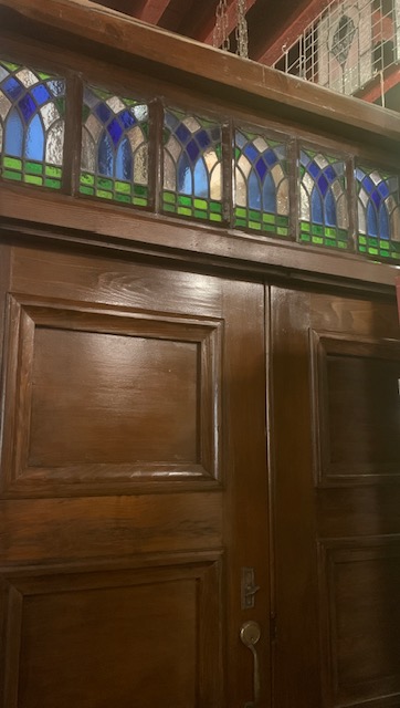 HOLD More detail of unusual circa 1900 solid timber external French doors, polished with Gothic arch pattern leadlight in blue, green and clear glass. Ex-public / institute building. Frame is 1435 W x 2560 H x 110 D (D97) $2200