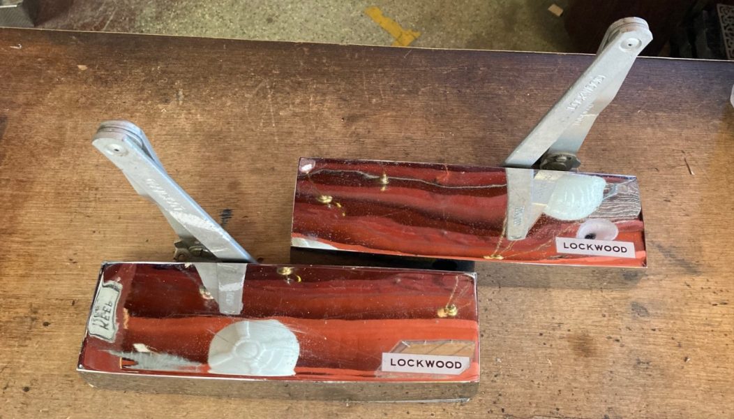 Polished chrome Lockwood heavy duty door closers (shiny silver has reflected the ceiling rafters!)$45 each