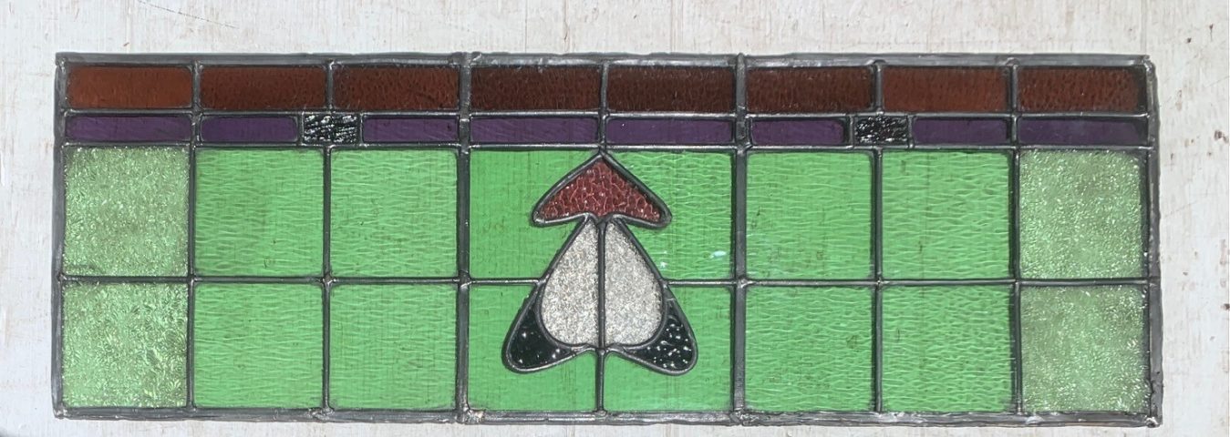 Original Art Nouveau leadlight panel, green, purple, pink, clear, 31cm x 91cm (LL67) $220