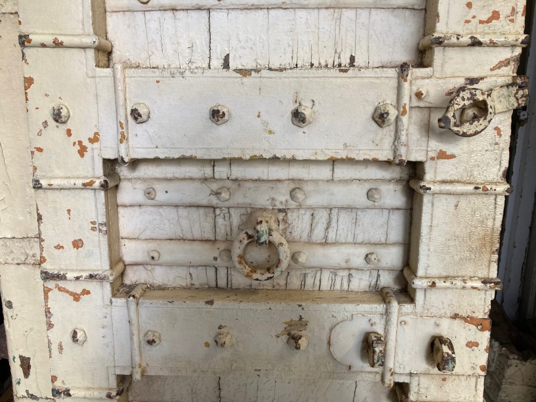 Detail of solid original Persian design entrance doors and frame with metal studwork and original cream paint, 2500mm high x 1460mm wide (D30) $1800