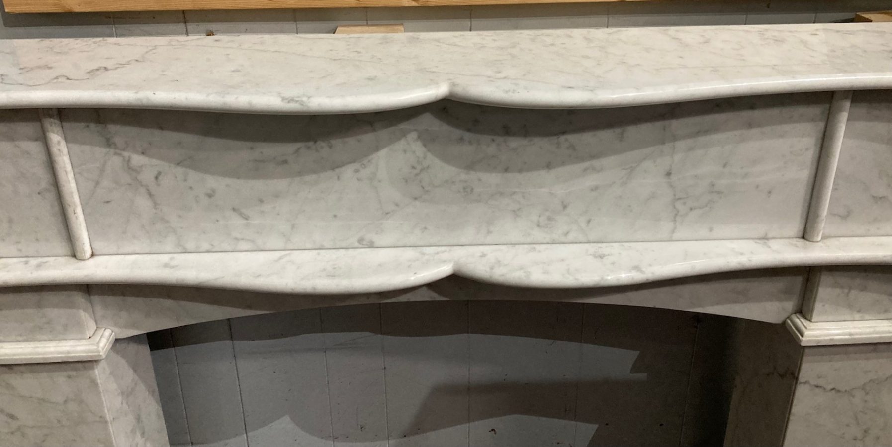 Detail of unusual flowing white marble mantelpiece, top shelf 1520mm wide x 230mm deep, height 1105mm, opening 935mm wide x 780mm high (M33) $1400