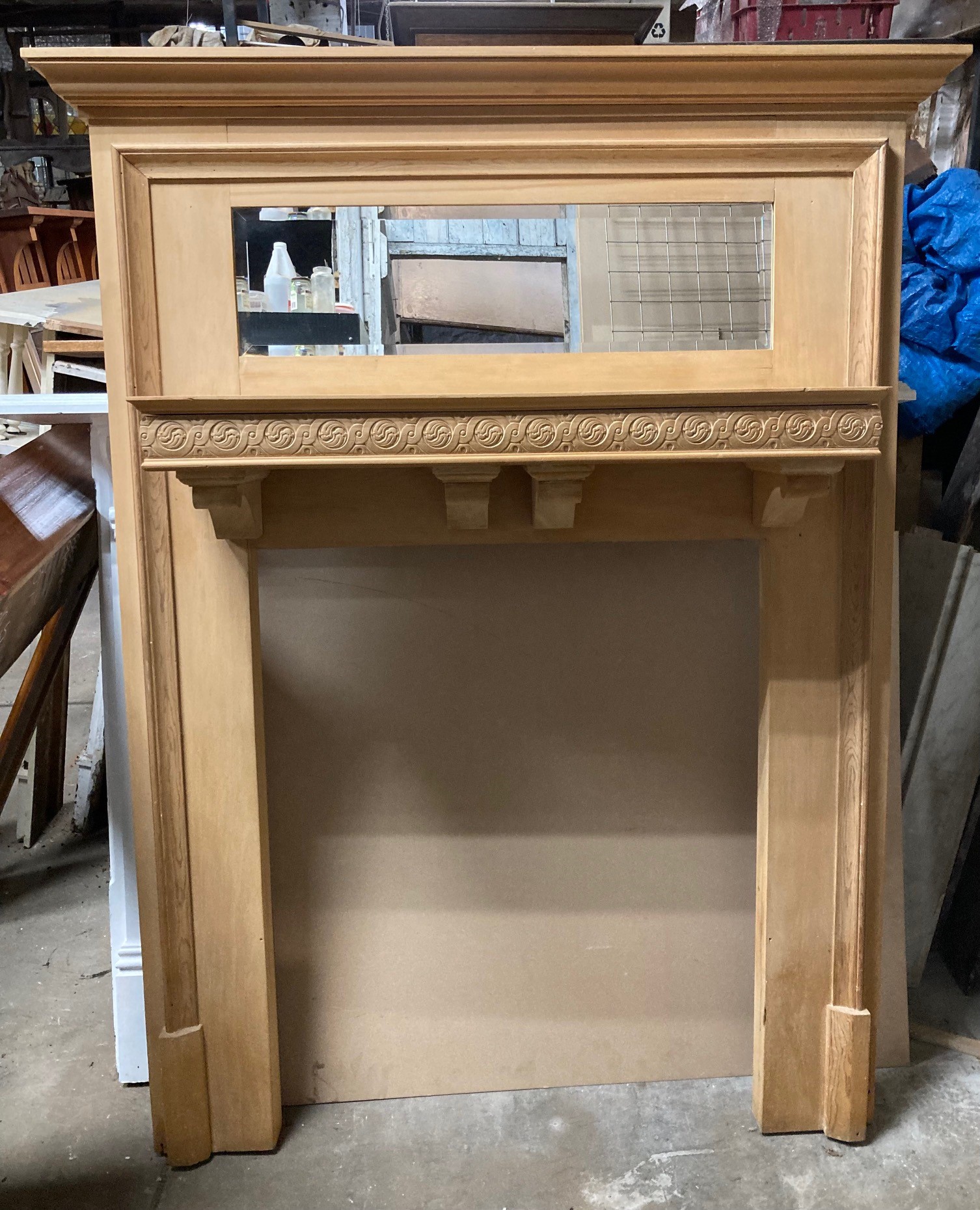 SOLD Unusual Tudor and bungalow style raw Kauri pine mantelpiece with bevelled mirror and ornate carved shelf, 1370mm wide x 1750mm high x 310mm deep, opening 830mm wide x 1030mm high (M39) $785